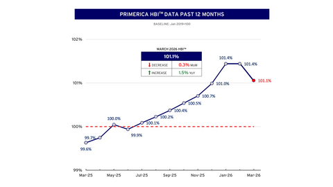 DULUTH, Ga.--(BUSINESS WIRE)--The latest Primerica Household Budget Index™ (HBI™) data, a monthly economic metric that examines how inflation and wage trends impact the ability of middle-income families to afford life’s everyday necessities, is estimated at 101.1% in March, down 0.3% from February and up 1.5% from a year ago.
