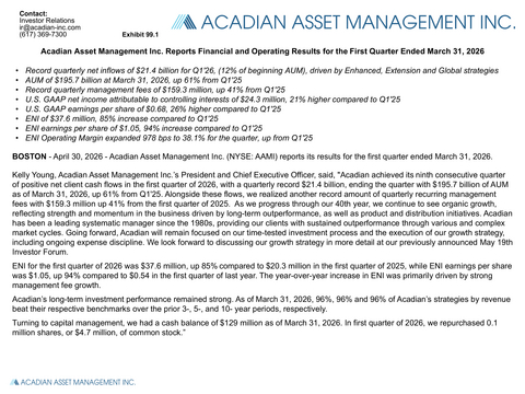 BOSTON--(BUSINESS WIRE)--Acadian Asset Management Inc. (NYSE: AAMI) today announced its results for the first quarter ended March 31, 2026.
