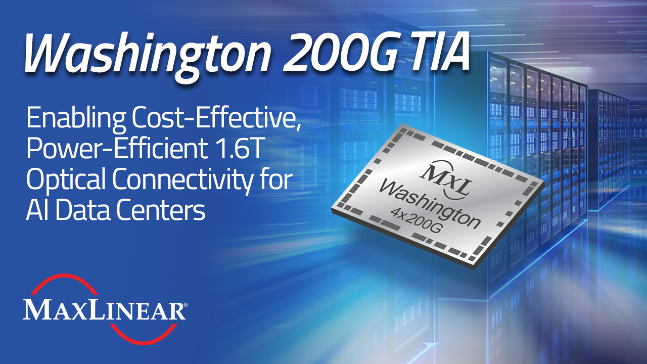 CARLSBAD, Calif.--(BUSINESS WIRE)--MaxLinear, Inc. (Nasdaq: MXL), a leading provider of high‑speed interconnect ICs for data center, metro, and wireless transport networks, today announced availability of its Washington TIA, a four-lane, 200G/lane transimpedance amplifier designed for 1.6T optical transceiver modules for AI data center applications. As hyperscale data centers scale bandwidth and reach to support larger AI clusters, Washington delivers a low-power, low-noise linear analog front end tailored for next-generation optical architectures.