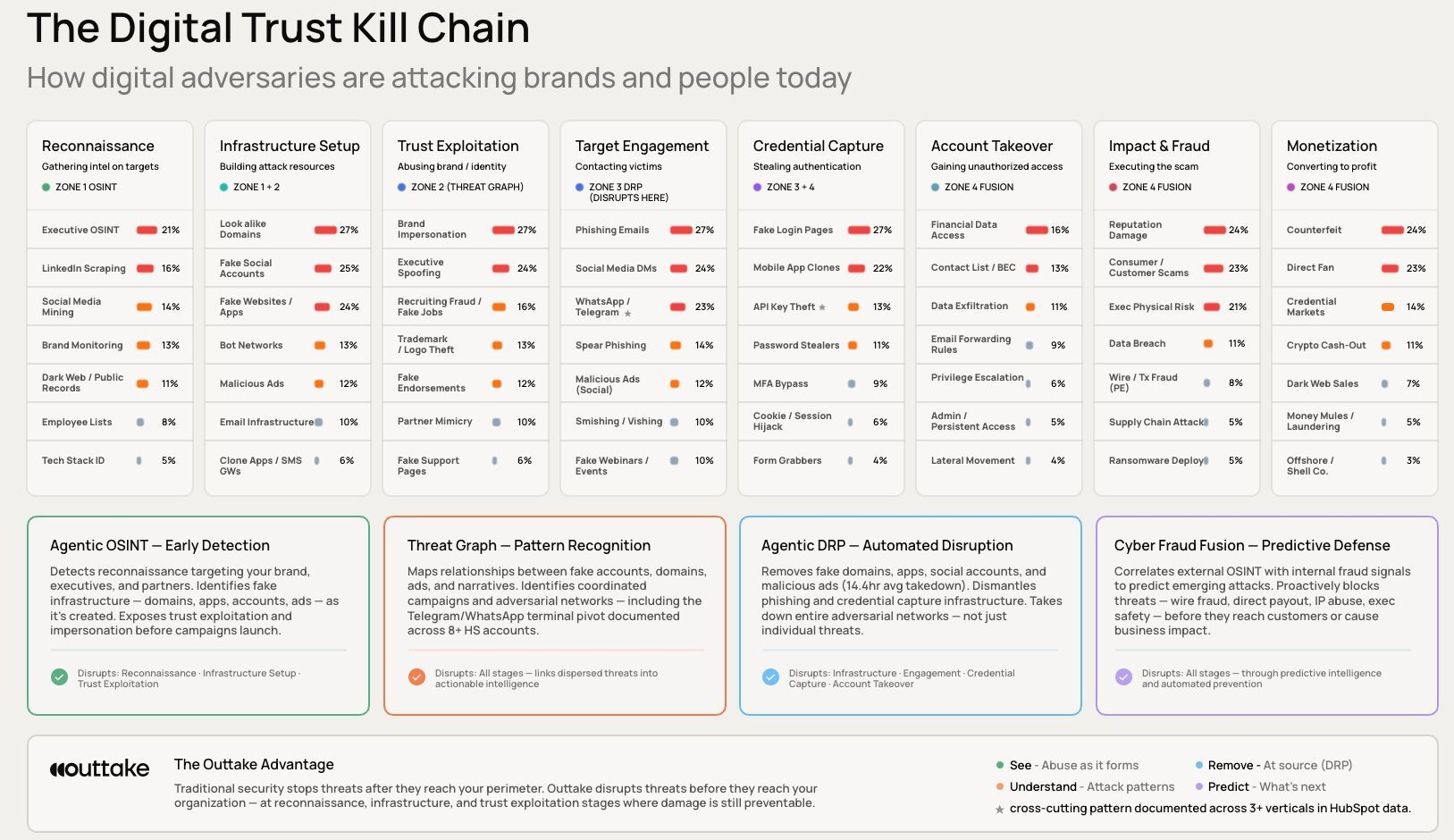NEW YORK--(BUSINESS WIRE)--Today Outtake, the digital trust platform helping organizations detect, investigate, and disrupt identity-based threats across the AI-native web, announced the Digital Trust Kill Chain, the industry's first framework documenting how AI-powered adversaries systematically attack organizations, alongside Outtake Recon Agent, the first agentic tool built to dismantle those operations before they strike.