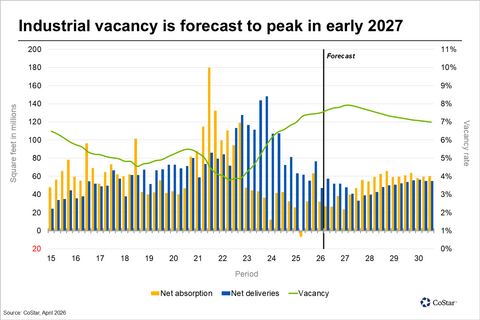 ARLINGTON, Va.--(BUSINESS WIRE)--U.S. industrial vacancy is projected to rise into early 2027, according to a revised forecast from CoStar, the leading global provider of online real estate marketplaces, information and analytics in the property markets.