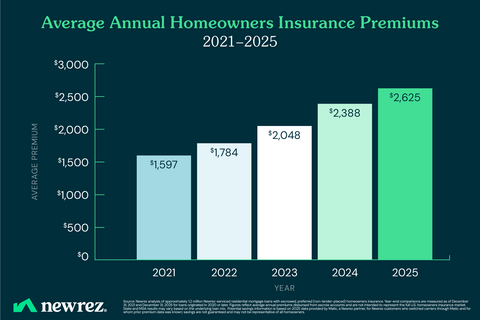 FORT WASHINGTON, Pa.--(BUSINESS WIRE)--Newrez, a top five mortgage lender and servicer, today released findings from an analysis of roughly 1.2 million Newrez-serviced residential mortgage loans. According to the study, the average annual homeowners insurance premium increased 64% between year-end 2021 and year-end 2025 when the average premium grew from $1,597 to $2,625.