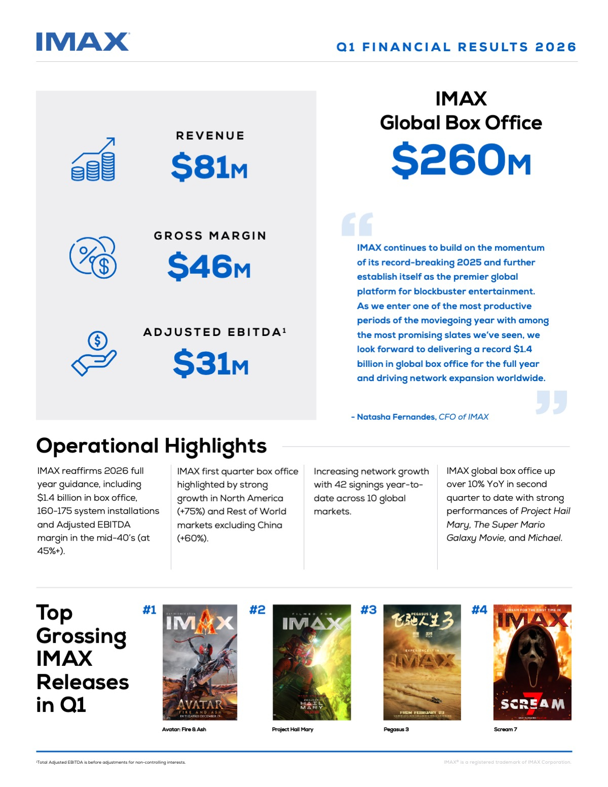 NEW YORK--(BUSINESS WIRE)--IMAX Corporation (NYSE: IMAX) today reported financial results for the first quarter of 2026, demonstrating the value of its unique global entertainment platform and broad content portfolio.